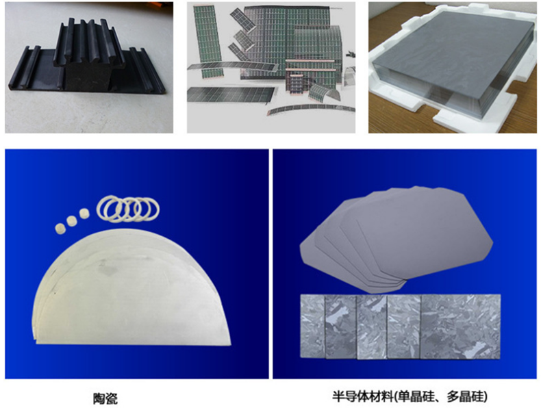 可用于切割玉石、玻璃、陶瓷、石墨、瑪瑙、紅寶石、藍寶石、亞克力、單晶硅、多晶硅、碳化硅、耐火材料、巖樣、復(fù)合材料、環(huán)氧板、鐵氧體等不導電材料的切片開方及直體異形的加工切割