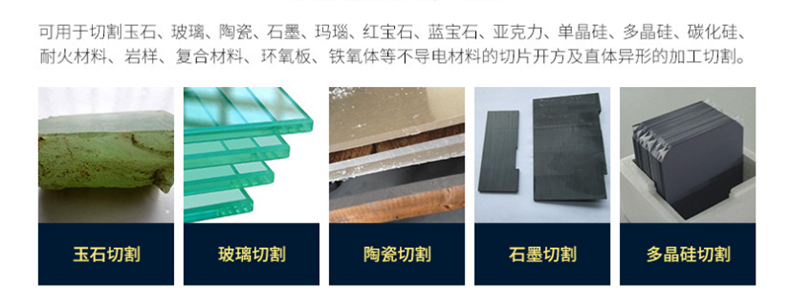 可用于脆硬材料的異形和切片加工,如:藍寶石、單晶硅、多晶硅、氧化鋁、陶瓷、寶石玉等材料。